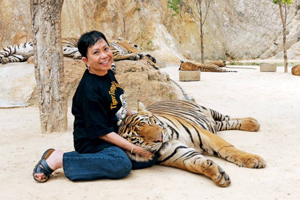 Hình ảnh mẹ của Tiger Woods, bà Kultida ôm một con hổ sống. Chỉ có điều, đây không phải là một con hổ con. Đây là một con hổ đực trưởng thành nặng gần 250 kg tại Chùa Hổ ở Thái Lan, nằm ở một khu vực trống trải dưới đáy một hẻm núi đá, với chỉ một nhà sư Phật giáo mảnh khảnh trong chiếc áo cà sa màu cam mỏng manh cầm một cây gậy làm người bảo vệ. Theo nhiều người kể lại, ngôi chùa đã làm một công việc đáng ngưỡng mộ trong việc "in dấu" những con hổ để chúng cảm thấy thoải mái khi tiếp xúc với con người, và hàng nghìn người từ khắp nơi trên thế giới đến thăm mỗi năm mà không có sự cố nào được báo cáo. Con hổ này, cùng với khoảng một chục con khác trong bán kính 45 mét được giám sát bởi các nhà sư khác, đang chìm sâu vào giấc ngủ trưa.