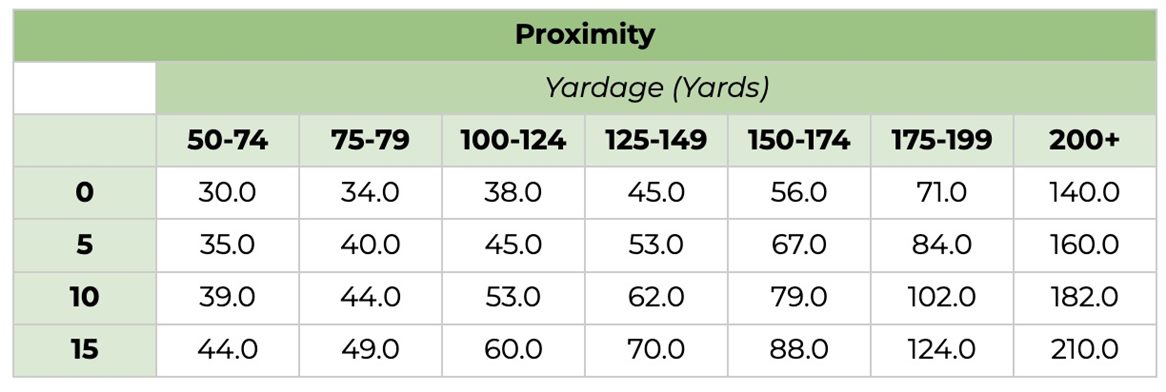 Bảng trên cho thấy, HCP 0 có khả năng đánh tiếp cận gần mục tiêu với khoảng cách trung bình từ bóng đến hố gần nhất. Cự li 50-74 yards, bóng cách mục tiêu sau cú đánh trung binh 30 feets (HCP 5 là 35 feets, HCP 10 là 39 feets và HCP 15 là 44 feets). Ở cự li 150-174 yards, HCP 0 có cự li trung bình từ bóng đến cờ sau cú đánh tiếp cận là 56 feets, HCP 15 là 88 feets.