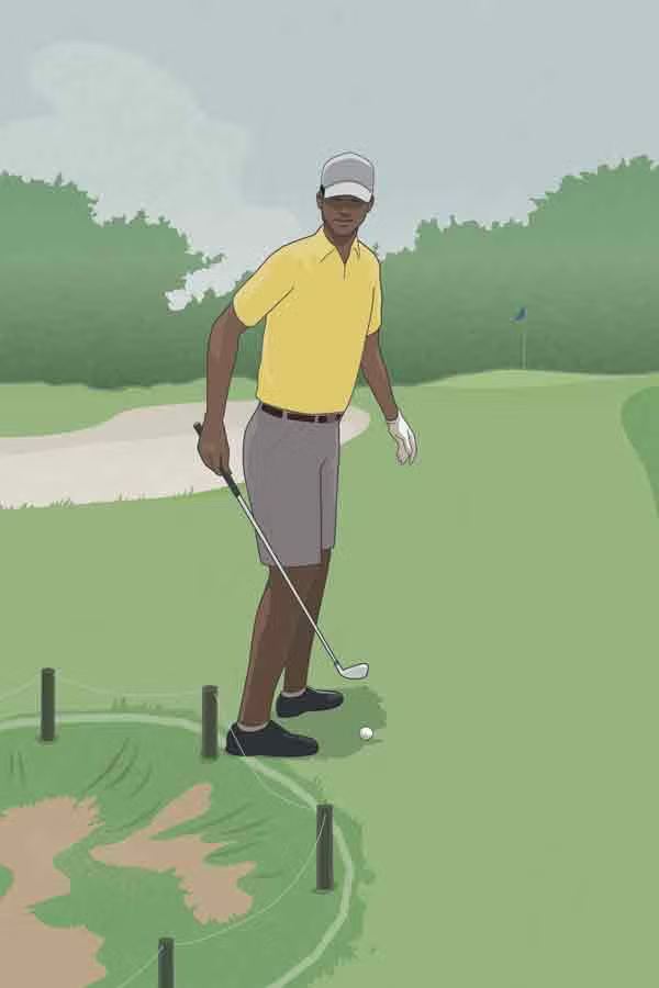 Tình huống: Bóng nằm ở rough, nhưng vòi phun nước cản trở tư thế đứng. Điểm thả bóng gần nhất vẫn trong rough, nhưng 1 gậy dài lại chạm tới fairway.