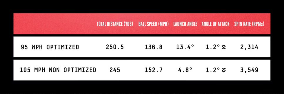 Để hiểu rõ tầm quan trọng của việc đưa gậy nhanh hơn so với tối ưu hóa cú đánh hiện tại, các chuyên gia thử nghiệm 2 cú đánh driver với tốc độ: 95 mph và 105 mph, sử dụng gậy driver 10.5 độ cùng robot mô phỏng cú đánh của Golf Laboratories—loại robot được các hãng sản xuất thiết bị cũng như USGA và R&A sử dụng. Dữ liệu gậy và bóng được đo bằng máy GCQuad của Foresight Sports.