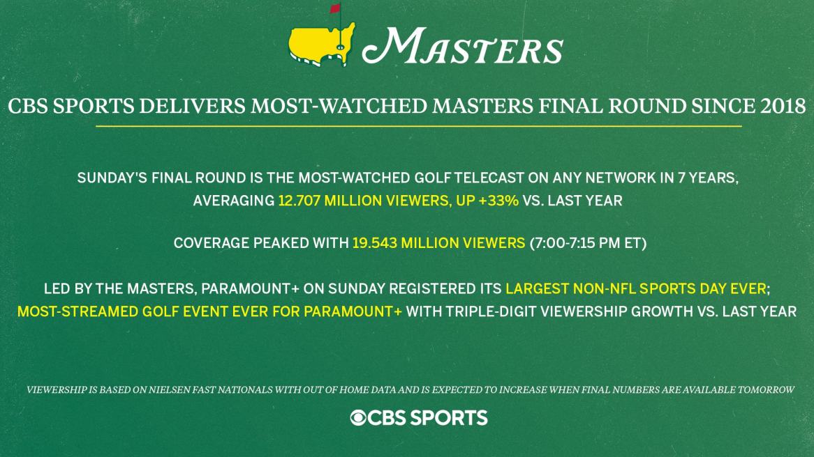 Chiều thứ Hai, CBS công bố tỷ lệ xem TV cho vòng chung kết diễn ra vào Chủ nhật, tuyên bố đây là "vòng chung kết Masters có lượng người xem cao nhất kể từ năm 2018", khi Rory McIlroy giành chiến thắng sau loạt playoff để đoạt chiếc áo xanh đầu tiên cùng Grand Slam sự nghiệp trong làng golf.