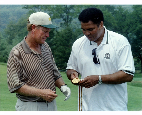 Muhammad Ali 'khoe' huy chương vàng Olympic với huyền thoại Jack Nicklaus ở hố 9 sân Valhalla Golf Club ở Louisville, Ky.,năm 1996.