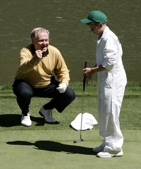 13, Jack Nicklaus chúc mừng cháu trai kiêm 'caddie' Charlie Nicklaus, 11 tuổi, khi thực hiện cú putt ghi điểm ở vòng PAR3 Contest giải The Masters hàng năm (Augusta National Golf Club in Augusta, Georgia, 5/4/2006)